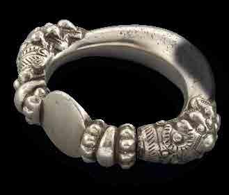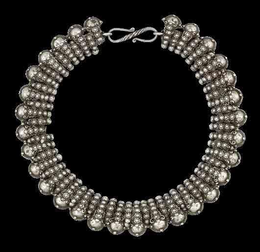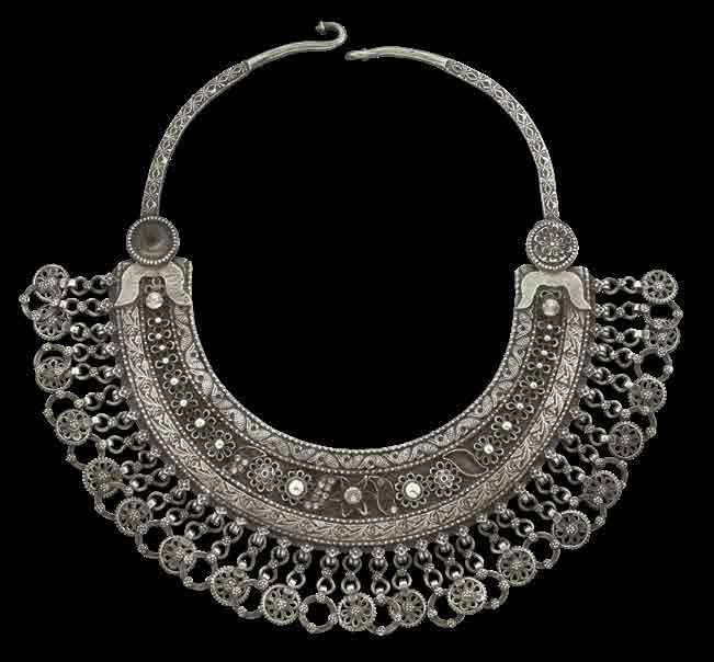 For long, the silver jewellery of the genre presented here has been termed “tribal,” implying that it constitutes the adornment of a segment of society that lies outside the social, economic and political mainstream. The Oxford Dictionary describes “tribe” as “a group of people in a primitive or barbarous stage of development.”1 As anthropological studies of tribes evolved, the description was modified to characterize “tribe” as a “notional form of human social organization based on a set of smaller groups (known as bands), having temporary or permanent political integration, and defined by traditions of common descent, language, culture, and ideology.”2 In the Indian context, accounting for the vast number of tribes and their complex origin stories, as well as their diverse and heterogenous organizational structure, tribes were described much more broadly, as “a large assortment of communities, differing widely in size, mode of livelihood and social organization.”3