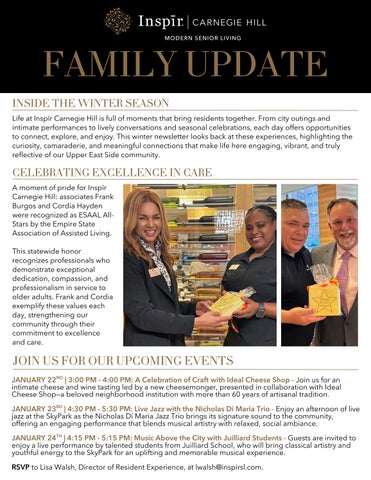 If any of these signs or scenarios are occurring with your loved one, it may be time to meet with his/her medical provider. A lack of safety awareness as in many of the above examples, can often lead to very dangerous and even potentially life-threatening situations. We advise you to seek medical advice for suggestions or alternative care options to meet changing needs. If you would like more information, please contact Inspīr Carnegie Hill. Our knowledgeable staff of professionals understands and is here for you throughout the journey. 1802 Second Avenue | New York, NY 10128 646.907.1500 | InspirSeniorLiving.com