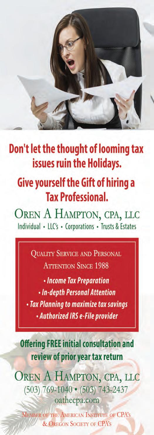 Home for the Holidays Our T own Santiam November 2022 15 Holidays Choose a gift that will last a lifetime. Start or complete your degree or certificate at Chemeketa Community College this winter. We offer training in over 90 of the Willamette Valley’s most in-demand jobs, with many programs that can be completed in two years or less. Scholarships and financial aid are available to help you reach your goals. Winter term starts Jan. 9. EO/AA/ADA/Title IX institution Find your program: go.chemeketa.edu/programs 503.399.5000 getstarted@chemeketa.edu