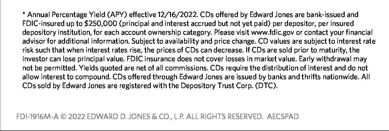 Compare Our CD Rates 3-Month 4.40 %APY * 6-Month 4.50 %APY * 12-Month 4.60 %APY * Roberts, Ring & Fischer Wealth Management, Inc. (503) 873-3684 www.rrfwealth.com 201 S. Water St. Silverton, OR 97381 Securities offered through LPL Financial, a registered investment advisor. Minimum deposit $1,000 Minimum deposit $1,000 Minimum deposit $1,000 As of 12/20/22. CDs are FDIC insured to specific limits and offer a fixed rate of return if held to maturity, whereas investing in securities is subject to market risk including loss of principal