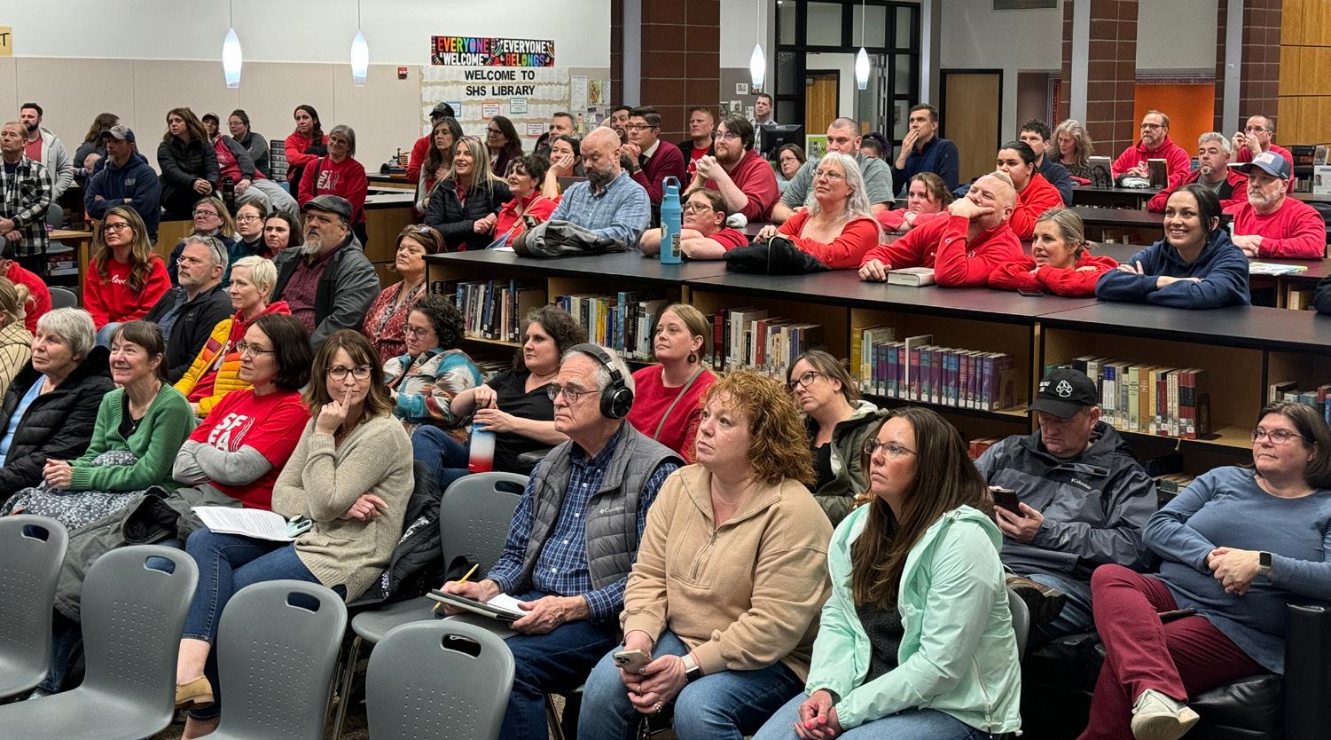 Residents and district employees pack the Silverton High School library for the March 11 meeting of the Silver Falls School District Board amid ongoing discussions of a projected $825,000 deficit. STEPHEN FLOYD