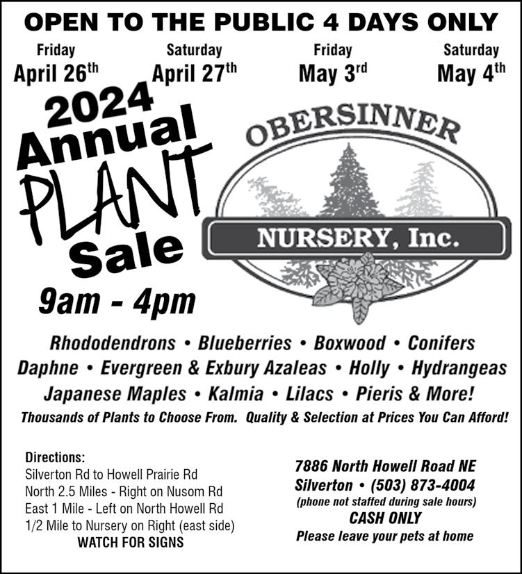 Zoom (Meeting ID# 880 1701 9820) and at the Library Program Room, 410 S. Water St, Silverton. The agenda will include the FY 25 budget message and public comment. A copy of the budget document may be obtained on or after April 17 at the Library during open hours or on the website www.silverfallslibrary.org. Please call 503-873-5770 or email (shigby@silverfallslibrary. org) at least 48 hours prior to the session if you require accommodations to fully participate in this meeting. 3/29/24