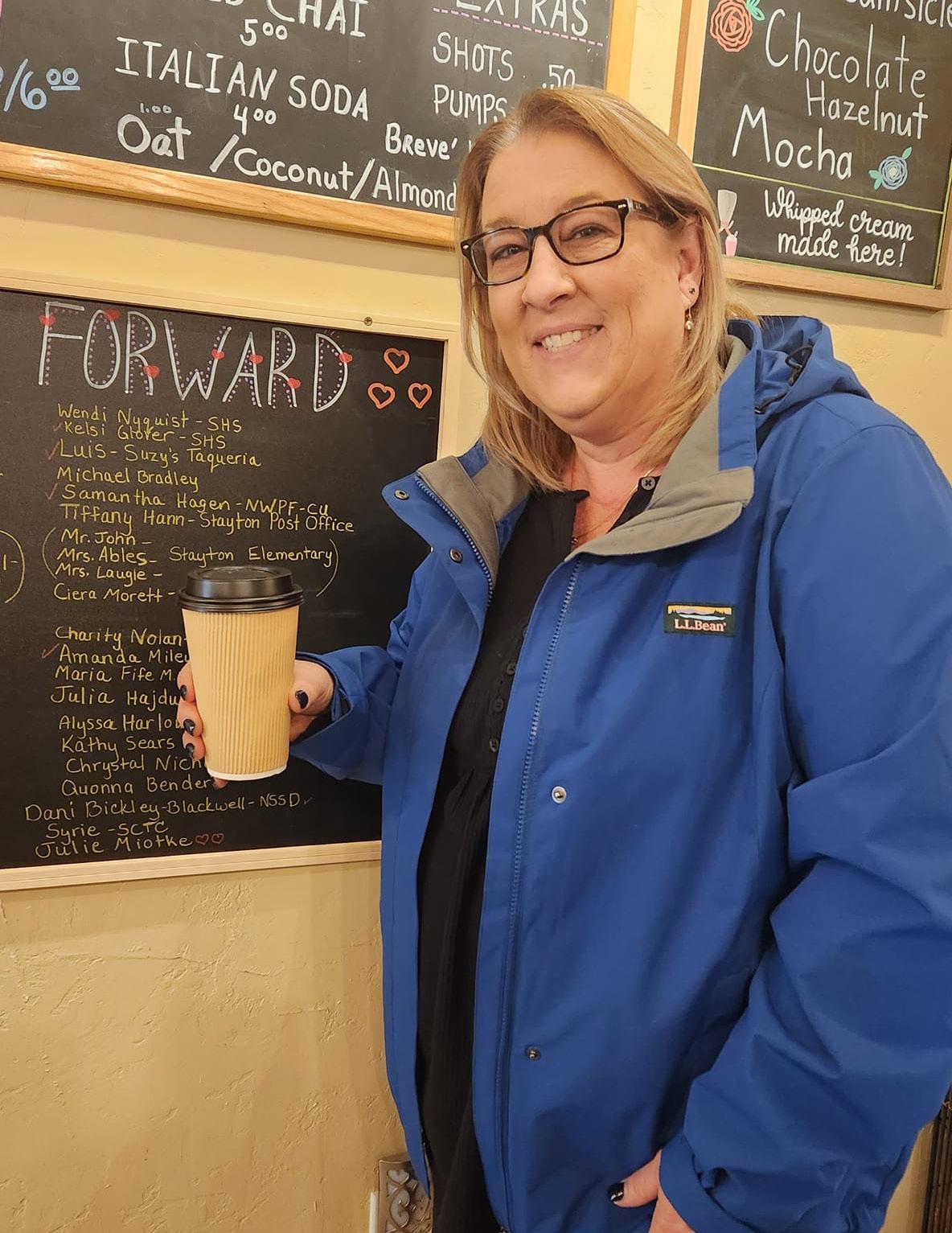 Since the pay-it-forward event started in late January, more than 100 people have been honored with a coffee or other drink of choice. With the purchase of a drink to appreciate a favorite person, names are listed on the Pay It Forward blackboard in the coffee shop. Stevens also notifies the recipients and, when they redeem their reward, posts their photo online, complete with a paragraph on why they were honored. Who bought the drink usually remains a secret, she said.