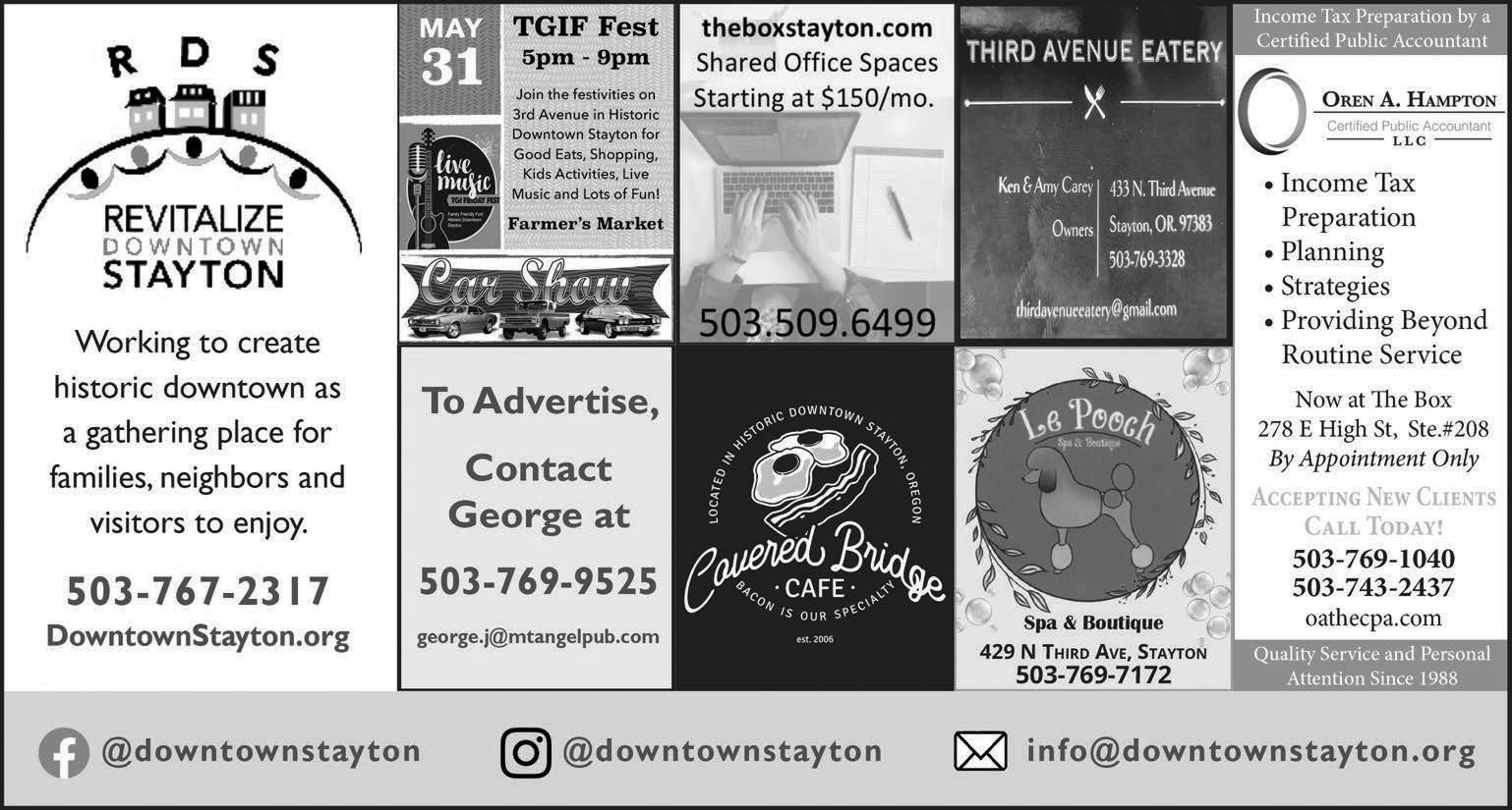 2 • May 2024 ourtownsantiam.com Facebook: OurTown / Santiam Stayton’s only LOCALLY OWNED and OPERATED Recreational and Medical Dispensary Proudly Serving Our Community Since 2015 Located in Historic Downtown Stayton 277 N Third Avenue Open 9 – 7, 7 Days A Week Call: (503) 979-0298 for Curbside Service Do not operate a vehicle or machinery under the influence of this drug. For use only by adults 21 years of age or older. Keep out of reach of children. HomeGrown H Remedies HG