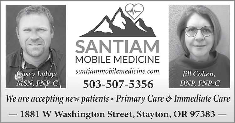 Shryock North Santiam Funeral Service 224 N. Third Avenue, Stayton (503) 769-9010 Office hours: Mon - Sat 9-5 • 24 hour availability • www.santiamfuneral.com • nsantiamfs@wvi.com “Our family serving yours” The area’s only locally-owned and owner-operated funeral home Glenn has personally served the community for over 29 years. Glenn Hilton Family, Owners Office hours: Mon - Fri 9-5 • 24 hour availability • www.santiamfuneral.com • nsantiamfs@wvi.com Glenn has personally served the community for over 30 years. – Locally-owned and owner-operated funeral home –Glenn Hilton Family, Owners Serving proud Americans and Veterans with American-made caskets. • Tree Pruning • Tree Removal • Tree Trimming • Clean-Up • Brush Removal • Stump Grinding CENDI SANDOVAL 971-239-2295 cendifrias1985@gmail.com CCB#228026 FREE ESTIMATES! Safety and customer satisfaction is our priority! Licensed • Insured • Bonded
