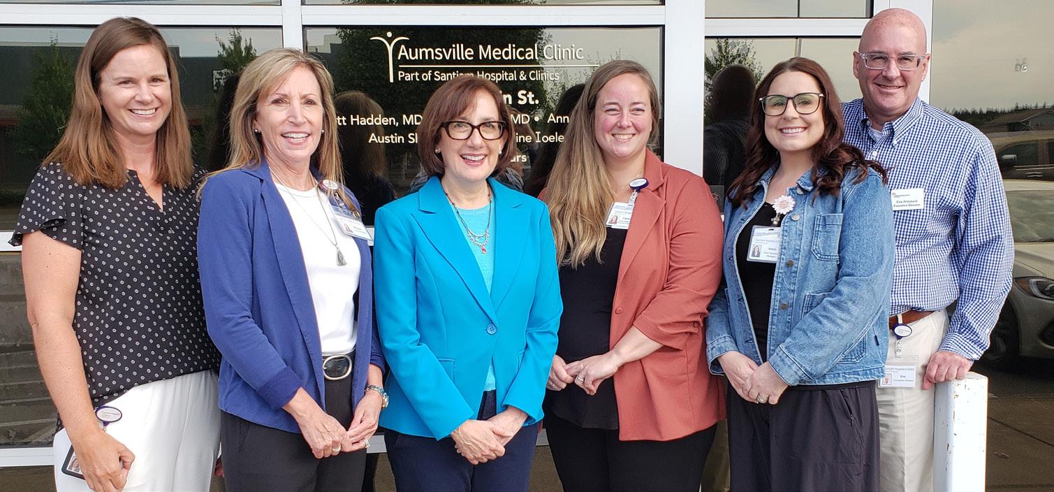 U.S. Rep. Andrea Salinas, third from left, at Santiam Hospital’s Aumsville Medical Clinic. Joining her were hospital officials , from left, Melissa Baurer, executive director of community development; Maggie Hudson, CEO and president; Cassondra Posvar, executive director of revenue & reimbursement; Abbie Proctor, primary care operations manager; and Eric Pritchard, executive director of the hospital foundation. JAMES DAY