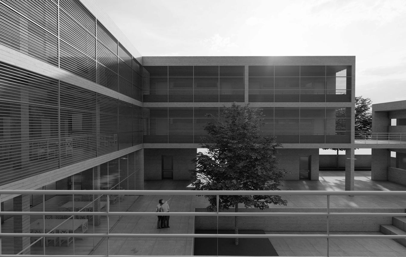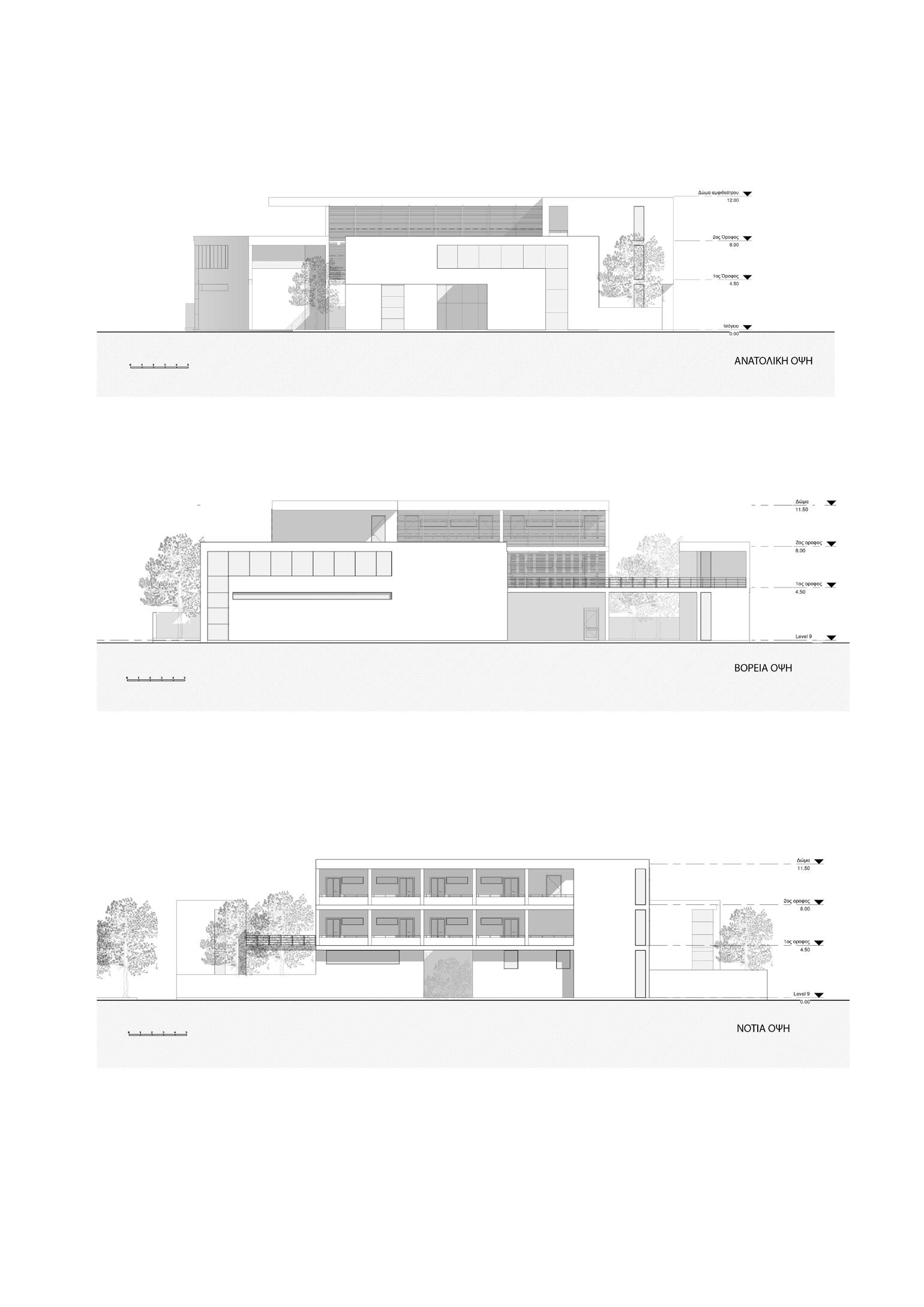 The main two-story volume of the building is shaped in a “Γ” shape in the eastern part of the site with a perimetrical bridge on the first floor and an amphitheatrical outdoor yard on the ground floor. The composition is formed around two