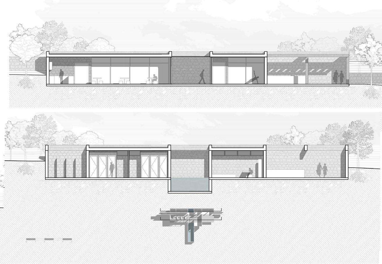 The central space of the composition includes a cafe, an area with tables for eating, reading and resting, a small kitchen and the necessary auxiliary spaces. This particular space is closed for the winter months, however the frames can be slid and the interior space can be integrated with the exterior during the summer months.