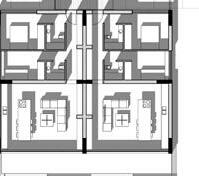 On the second floor are the other two residential units and a common living room. Finally, in the basement are the toilets as well as the required storage and auxiliary spaces.