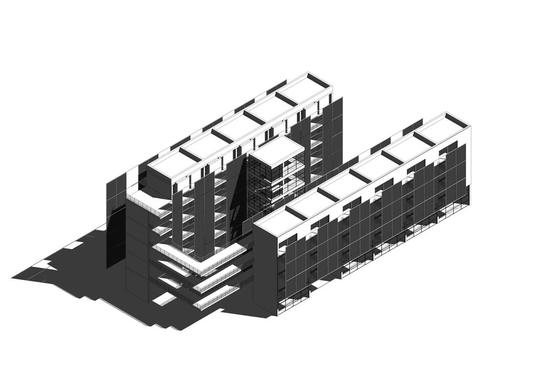 The composition includes four residential complexes. The first and largest includes 100 residences. The basic compositional idea is for the apartments to be developed on two floors each and the shared traffic zones to be located every three floors, as shown in the section. This building is developed in a “T” shape, including a pilaster on the ground floor, shared living rooms, 4 central staircases as well as a large library at the junction of the vertical and horizontal axis of the composition.