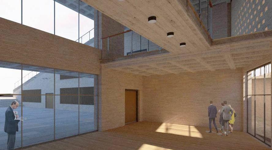 integration of different uses. In addition, there is the possibility of reconfiguring the space by withdrawing the seats and the stage, as we propose that the room can also be used for music and dance rehearsals and classes. The basic material is wood. Two different shades of wood are used (light and dark), which, combined with the deep red velvet of the curtains and seats, create a feeling of warmth. Finally, the specific internal configuration is also expressed on the facades of the building through the wooden panels in selected places.