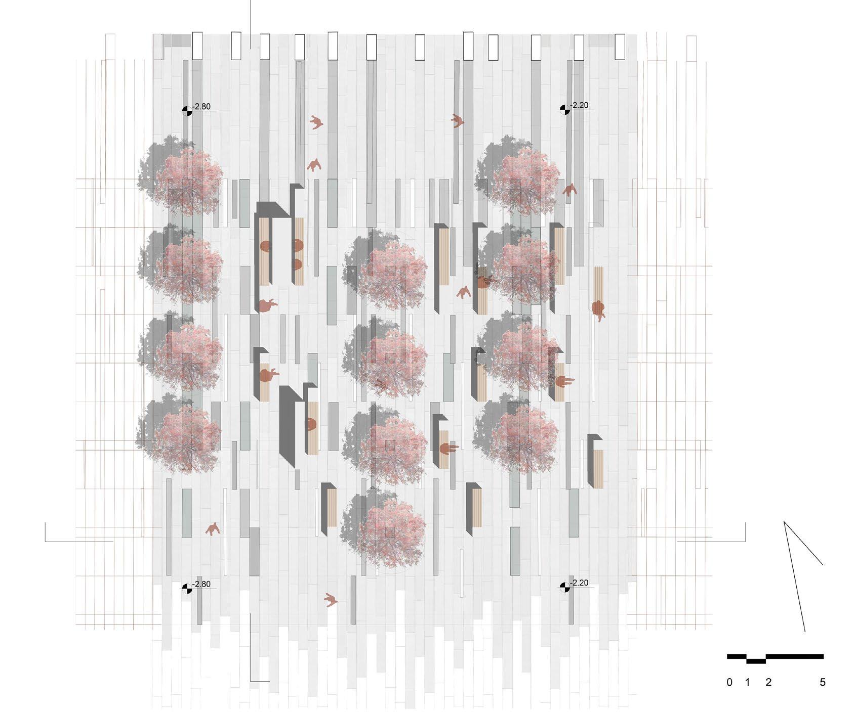 the water and the intense vegetation.The composition is divided into three main zones: the food production zone under specially designed metal canopies with fabric , the movement zone with running water and the rest zone. The overall synthesis follows the “comb” pattern.