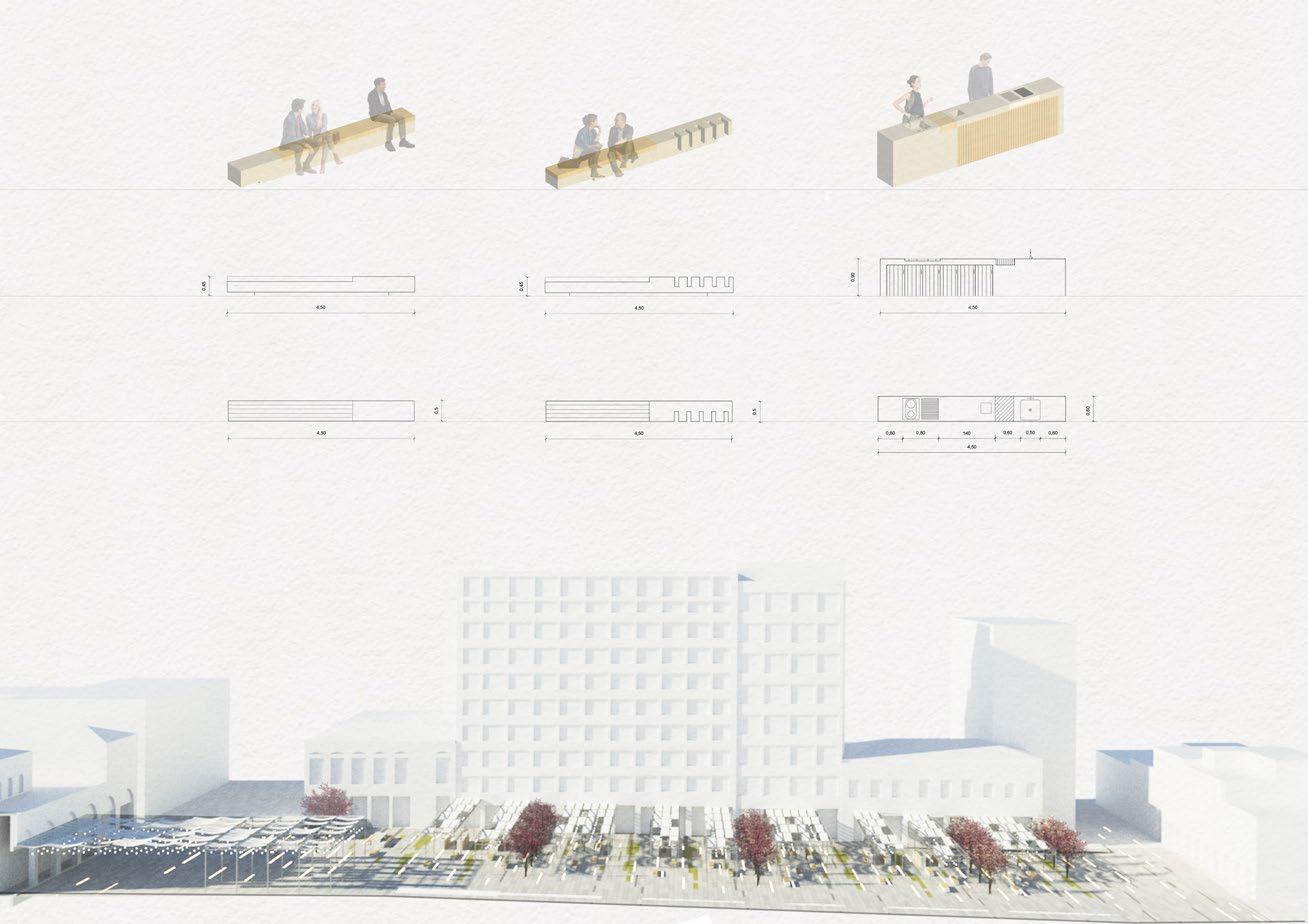 Τhe main idea of the composition is a square addressed to the historical market of Varvakeios. It is a multisensory square with an emphasis on the smell experience offered by the fresh products of the market. The main intention is to create public kitchens, where citizens can prepare their meals in specially designed cooking counters and enjoy them in sitting areas, next to