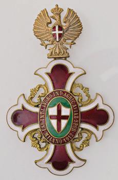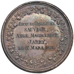 1518 Medaglia 1814. Ingresso trionfale in Parigi dei vincitori di Napoleone. D/ I tre sovrani a cavallo si dirigono verso un arco di trionfo sul frontespizio del quale sono incise le lettere : “A.F.W.V.”. In alto, tra le nuvole, un angelo planante porge una corona di alloro ai tre cavalieri (Alessandro I, Francesco I, e Federico Guglielmo III). Esergo: “TRIUMPH DER VERBUNDETEN MAECHTE IM JAHRE 1814” (Trionfo degli alleati nel 1814). R/ In corona di erami intrecciati di palma e di alloro, legenda in lingua tedesca in sette linee, sovrastata da una stella, sopra un altare con una cicogna al centro. All’interno 25 stampine colorate, collegate con un nastrino ma distaccate dalla medaglia, con scene di battaglie combattute dal 1812 al 31 marzo 1814. Chiusura perfetta della “boite”. Allegato contenitore in plexiglas per esposizione della medaglia e delle stampine interne. - Opus: Entlitzberger (?) - Bramsen n. 1381. Julius n. 2879 (foto pag. 43) - AG (g 33,36 - Ø <57 mm) Ex Gorny 12.10.2005 n. 7043 € 3200. Rarissima in queste dimensioni. Patina.