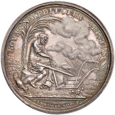 1520 Medaglia 1814. Congresso di Vienna . D/ Sulla parte superiore del globo terrestre si erge verso il cielo, planando tra le nuvole, la pace seminuda, con una corona nella mano dx e un ramo di palma nella sx. Circolarmente: “UNSTERBLICHKEIT DEN BEGLÜKERN EUROPENS” (FELICITÀ ETERNA DEGLI EUROPEI). Sotto la porzione di globo: HEUBERGER. R/ Nel campo, in corone intrecciate di rami di quercia, di alloro, di ulivo e di palma, le parole: VOLONTÀ, CORAGGIO, FORZA, SCOPO in tedesco. In basso: MDCCCXIII - MDCCCXIV. In alto: “HAT SIE VEREINT” (LI HA UNITI). All’interno 12 stampine, 6 delle quali con i ritratti di Alessandro I, Francesco I, Federico Guglielmo III, Massimiliano Di Baviera, Federico Guglielmo del Würtenberg, Federico VI Di Danimarca. Chiusura perfetta della “boite”. - Opus: Heuberger. Bramsen. n. 1530. Julius n. 3195. - AG (g 33,93 - Ø <54 mm) Ex Gorny 12.10.2005 n 7044 (€ 3.400). Eccezionalmente rara in queste superbe condizioni. Patina uniforme da conservazione in antico medagliere. qFDC 3.000