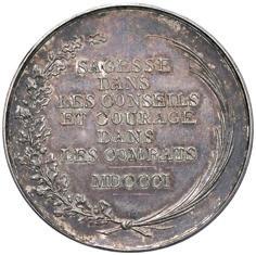 Medaglia 1801 Loggia degli allievi di Minerva. D/ (Loggia) DES ÉLÈVES DE MINERVE. Nel campo tra due rami di ulivo intrecciati in basso uno scudo ovale con testa di Medusa sovrastato da un gallo - R/ ILLOS AD VERAM LUCEM SAPIENTIA DUCIT. Nel campo in un cerchio formato da stelle un compasso e una squadra con al centro le lettere EDM intrecciate. Luna a sx. Sole raggiante a dx. In basso: 1801. - Opus: non indicato - Bramsen 186; Julius 1036; Tresor Numismatique 88.10; Labouret 209 (AE) - AG (g 8,35 - Ø 28 mm) Gettone massonico di grandissima rarità (mancante nella collezione A.N.P.B). Ex Hirsch Monaco 8.5.1996 n. 2453