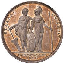 Medaglia 1801 Battaglia di Copenhaghen. D/ Un genio alato pone una corona su un’urna. Legenda circolare in lingua danese. In basso: J.U. - R/ scudo alle armi di Danimarca sovrastato dai nomi delle navi che hanno preso parte della battaglia. Esergo: D. 2 APRIL. - Opus: J. Ulstrup - Bramsen 2155; Julius 980 - AG (g 17,9 - Ø 39 mm) Medaglia danese rarissima. Nella rada di Copenaghen, il 2 aprile 1801, si affrontarono una flotta della Royal Navy, sotto il comando dell’ammiraglio Hyde Parker e le flotte della Danimarca e della Norvegia ancorate nel porto. In questa battaglia divenne famoso l’attacco comandato dall’ammiraglio Horatio Nelson che, disubbidendo all’ordine di Parker di ritirarsi, distrusse la maggior parte delle navi danesi prima che venisse accordata una tregua. In quel periodo i Paesi scandinavi e la Russia mantenevano una neutralità armata nei confronti delle guerre napoleoniche, nelle quali si affrontavano l’Inghilterra e la Francia del primo console Napoleone Bonaparte.