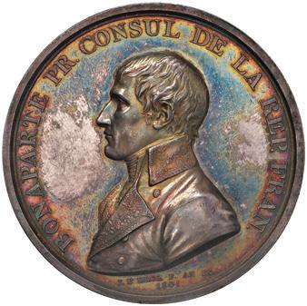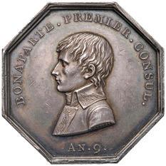 1503 Medaglia 1801 Agenti di cambio di Parigi D/ BONAPARTE - PREMIER - CONSUL. In basso: AN. 9. Nel campo busto a a sx in uniforme. Sotto il collo: H. AUGUSTE - R/ AGENCE DE CHANGE DE PARIS. Vista del Louvre e della Senna. - Opus: H. Auguste. - Bramsen 173; Julius 1026 “Frappe d’epoque en argent, d’aspect splendide, agreablement patinée, sur un flan tres epais”. - AG (g 31,20 - Ø 37,4 mm) Medaglia ottagonale. Segnetti nei campi. Ex iNumis Parigi 3.3.2020 n. 1501