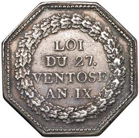 1505 Medaglia 1801 Tribunale di prima istanza del Dipartimento della Senna. D/ TRIBUNAL DE PREMIERE INSTANCE. La Giustizia in piedi con spada e bilancia. Esergo: DU DEP.T DE LA SEINE - R/ Corona formata da ramo di quercia e di alloro. Nel campo sotto occhio raggiante: CHAMBRE DES HUISSIERS CRÉE LE I.ER FRIMAIRE AN 10 - Opus: non indicato - Bramsen 177; Julius 1028 - AG (g 14,60 - Ø 33 mm) Gettone ottagonale. Patina. Segnetti. Ex F. Tuzio Parigi, convegno di Verona, 10.5.2002
