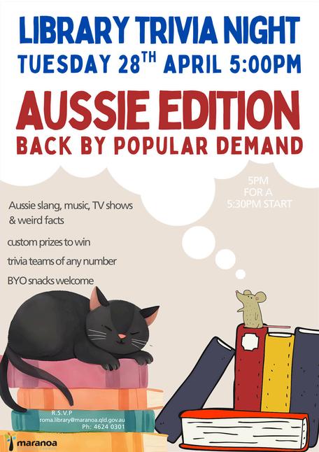 Celebrating 'Straya with questions about Aussie pop-culture: bands & songs, TV & movies, and general knowledge trivia. All ages, BYO snacks