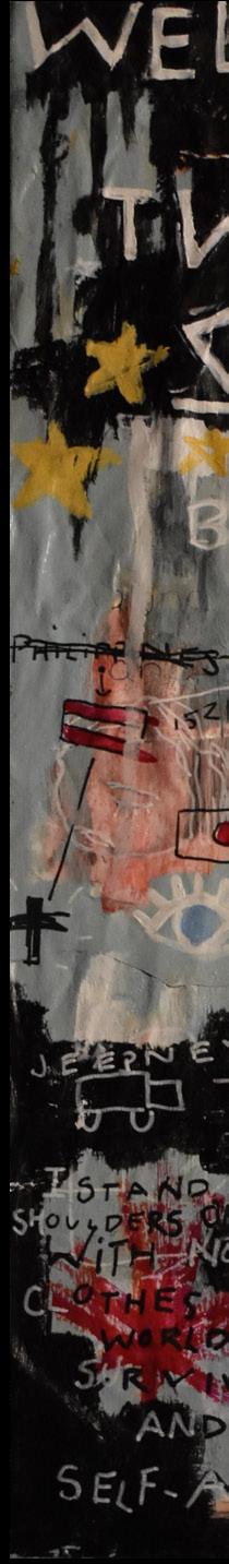 Mixed media. Acrylic paint, markers, oil pastel and nail polish on collaged canvas 18x24”