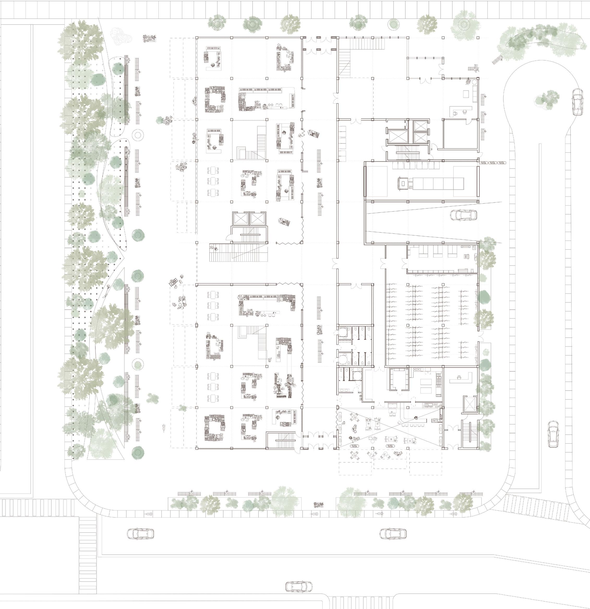 To further build on the neighbourhood’s desire for more public greenspace, the design extends into a public woonerf which sits adjacent to the building’s active market hall.
