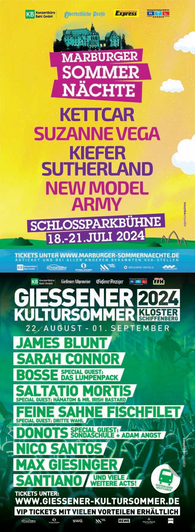 bei Kindern und Eltern. Dort lockt unter anderem die Express-Spielwiese mit großem Sandkasten. Es gibt ein Kettenkarussell und ein Bungee-Trampolin. Beim großen Kinderprogramm am Sonntag, 14. Juli, begeistert Iryna Chaplin mit faszinierender Sandmalerei und einer Seifenblasenshow. Sune Pedersen beeindruckt mit einem Mix aus Artistik, Zauberei und Comedy. Michael O. zeigt ein buntes Zauberprogramm für die ganze Familie. Suli Puschban & Die Kapelle der guten Hoffnung schließich präsentiert Kindermusik – poetisch, witzig, politisch aktuell und musikalisch mitreißend. Wie immer mit von der Partie ist das Gießener Mathematikum. Im Schlosspark lädt das erste mathematische Mitmachmuseum der Welt mit seiner Ausstellung „Mathematik zum Anfassen“ zum Knobeln ein. Im Marburger Mitmachlabor Chemikum können die Besucherinnen