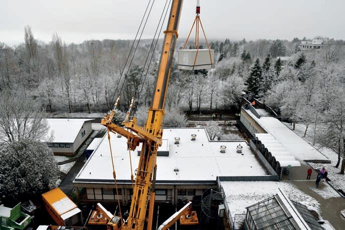 Die neue Mittelspannungsstation wurde mit dem Mobilkran vom Innenhof Biologie über die Werkstatt der Biologie und ein Gebäude des Max-Planck-Instituts für terrestrische Mikrobiologie zum eigentlichen Standort gegenüber der Alt-Anlage gehoben.