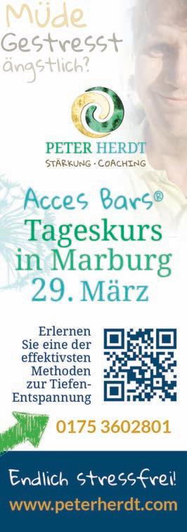 ● Körper-Bewegung-Entspannung: Body Awareness im Danceart MR mit 12 Terminen jeden Montag 1819 Uhr. Schnupperstunde Montag 20. April Info + Anmeldung Ursula Antonia Schulze-Oechtering 06424/ 921920 www.feine-koerperarbeit.de (gewerbl.)