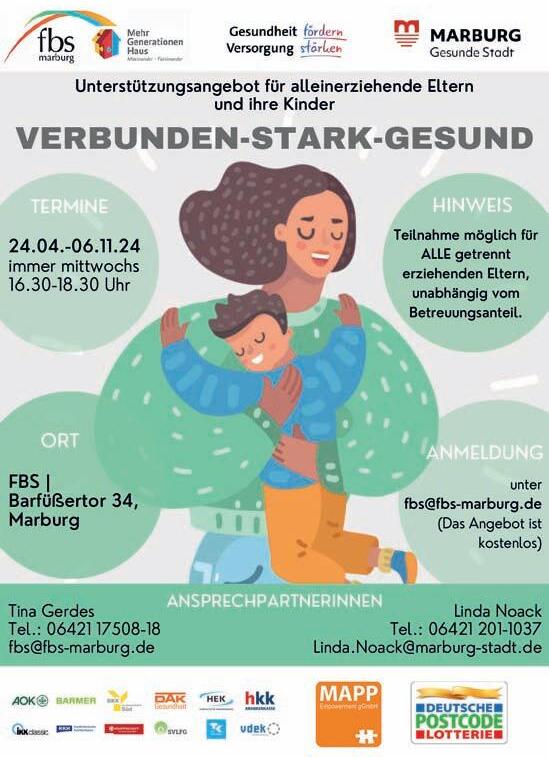 Das ist das Konzept des Präventionsprojekts „Verbunden-StarkGesund“ für alleinerziehende Mütter und Väter in Marburg. Mit zwei Eltern-AGs geht das kostenlose Unterstützungsangebot am 24. April in der Innenstadt und am 29. April in Wehrda weiter.