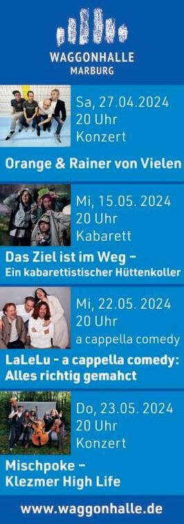 ● Am 27.04.2024 ist wieder Marburg-Con im Bürgerhaus Niederweimar, das traditionelle und familiäre Treffen für Freunde von Horror, Fantasy und Science-Fiction. Mit Lesungen, Vorträgen, Preisverleihungen und einer Phantastik-Bücherbörse mit vielen Autor:innen, Herausgeber:innen und Verlagen der Phantastik-Szene. Einlass ab 10:00 Uhr, Eintritt auf Spendenbasis. Weitere Infos unter www.marburg-con.de Veranstalter: Marburger Verein für Phantastik e.V.