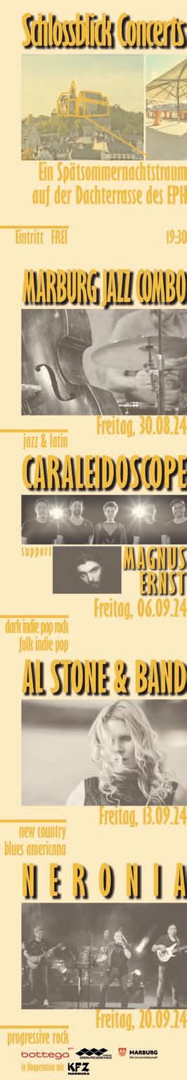 Eben war noch Sommerloch. Doch kaum neigen sich die Ferien dem Ende zu, gibt es in Marburg & Umgebung wieder ein volles Kulturprogramm. Auf der Dachterrasse des Erwin-Piscator-Hauses startet eine neue Konzertreihe mit Schlossblick in den Spätsommer. In der Waggonhalle hat der Varietésommer begonnen. Am Spiegelslustturm lädt die Hörtheatrale zur Vampirjagd ein. Im Q präsentieren beim „KunstPunkt“ Kreative ihre Arbeit. Im malerischen Ambiente Amönaus steht der Rapunzelmarkt an. Auf dem