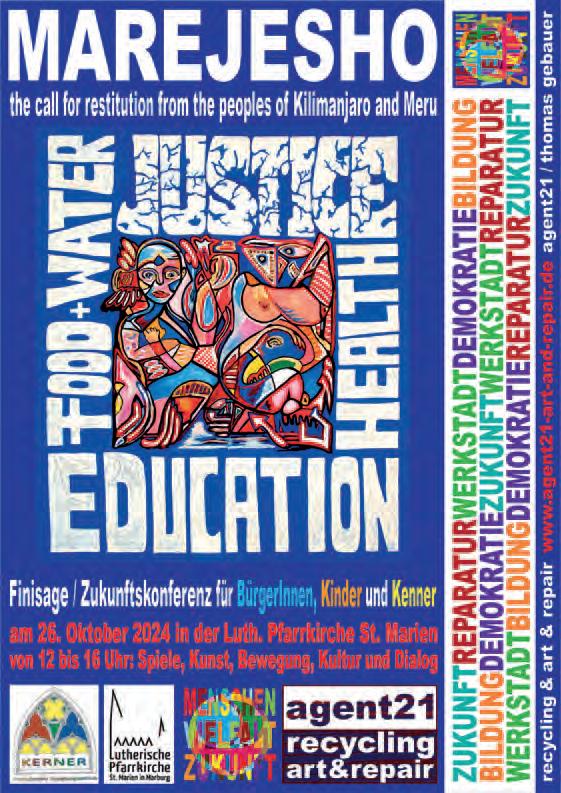 eines Community Museums für die Kilimanjaro-Region, welches restituierte Kulturgüter beherbergen und über die Kolonialgeschichte aufklären könnte. Voraussetzung für einen möglichen Heilungsprozess ist ein beidseitiges Verständnis dieser gewaltvollen Vergangenheit. Die Ausstellung MAREJESHO in Marburg kann hierzu einen Beitrag leisten. Wie jede deutsche Stadt hat auch Marburg koloniale Bezüge. Viele davon sind vermutlich vergessen und verdrängt, doch in den letzten Jahren begann Marburg mit der Aufarbeitung: Bis heute befinden sich Ahnen aus kolonialem Kontext in der medizinhistorischanatomischen Sammlung der PhilippsUniversität, erste Bemühungen zur Klärung der Provenienz werden unternommen. 2021 wurde das Denkmal für die sogenannten „Marburger Jäger“ im Schülerpark künstlerisch-historisch kontextualisiert. Diese waren aktiv an Kolonialverbrechen u.a. im Boxer-Krieg in China und am Völkermord an den Herero und Nama in SüdwestAfrika (heute Namibia) beteiligt. PM/Red