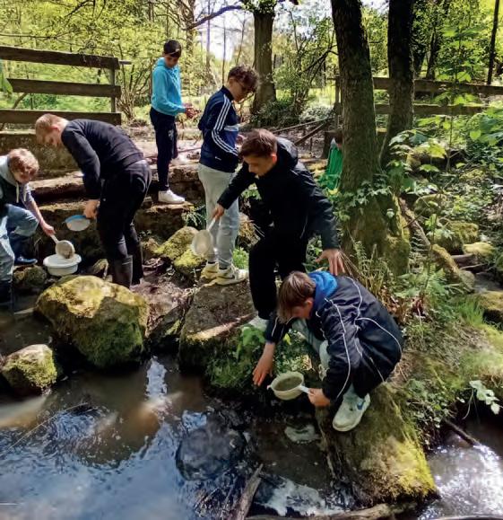 In der Nähe gab es einen Bach, dort machten wir einen kleinen Zwischenstopp. Wir bekamen einen Rucksack mit Ausrüstung. Hierzu gehörte eine Schüssel, ein Sieb, ein Löffel, eine Schale und ein Klemmbrett mit Informationsblättern und Protokollbögen. Die Schale füllten wir mit Wasser aus dem Bach. Mit einem Sieb ausgerüstet, stiegen wir in den Bach und fingen Tiere. Die gefischten Tiere gaben