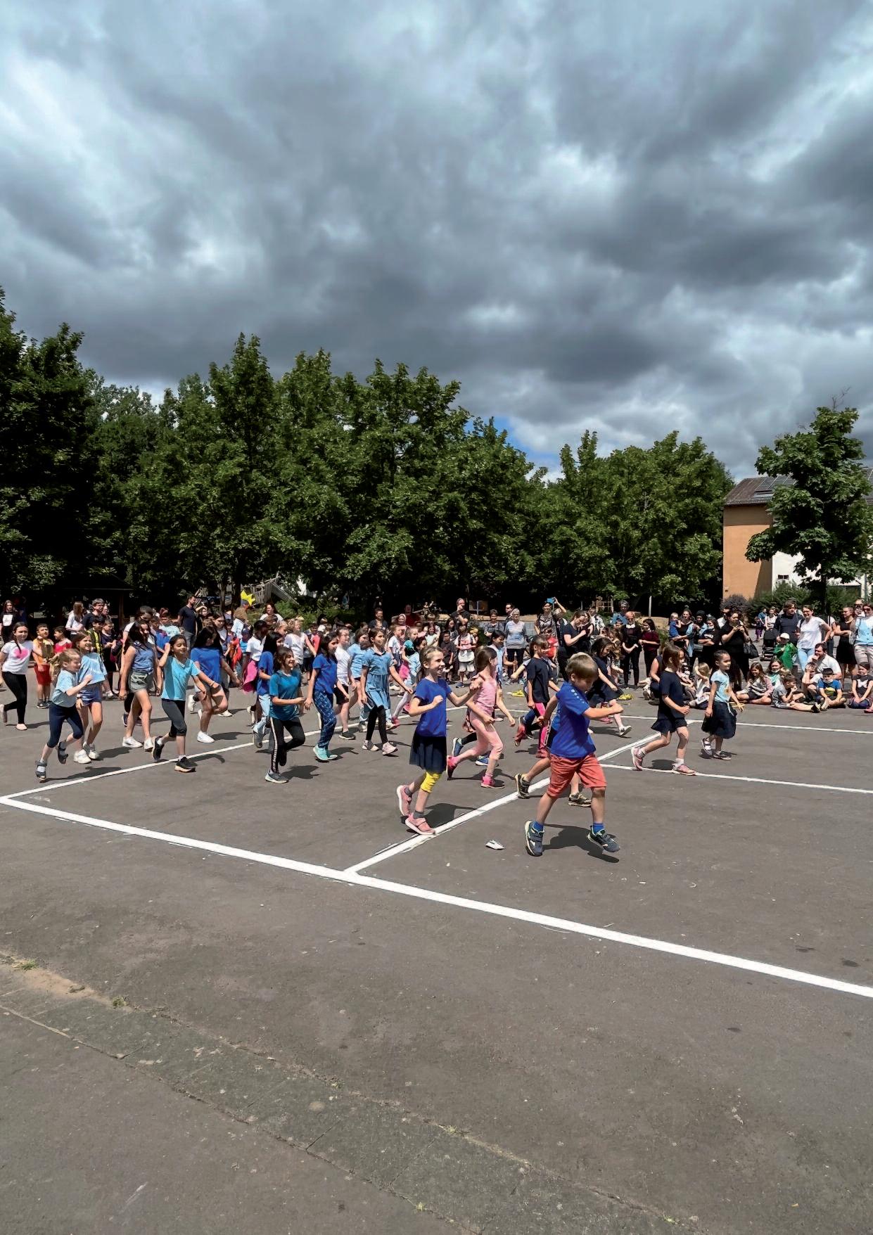 30 Minuten gemeinsam mit dem 9 und 10 Klassen zu laufen Diesmal befeuerte laute Musik die Laufenden, wobei auch ei nige Lehrer*innen beim Stempeln ihre Hüften schwangen Trotz 29 Grad wurden hier Rekorde von bis zu 16 Runden aufge stellt