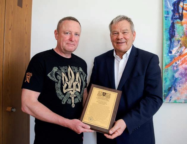 Der ukrainische Major Volodymir Strila hat bei seinem Marburg-Besuch erneut einen Gruß und ein Dankeschön für den Schutz der Familien von seiner Einheit mitgebracht. Foto: Lena-J. Schmidt, Stadt Marburg
