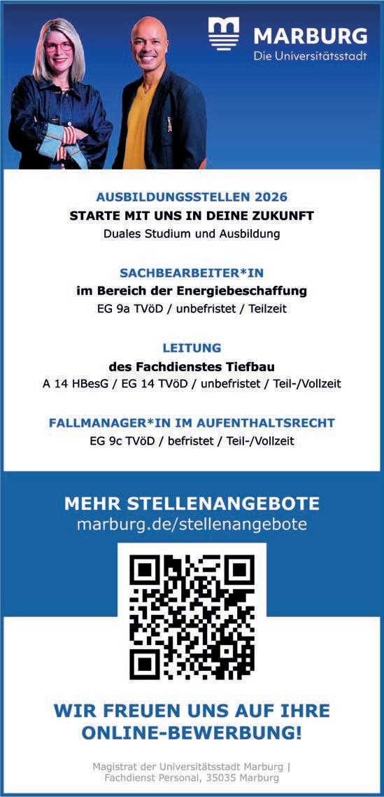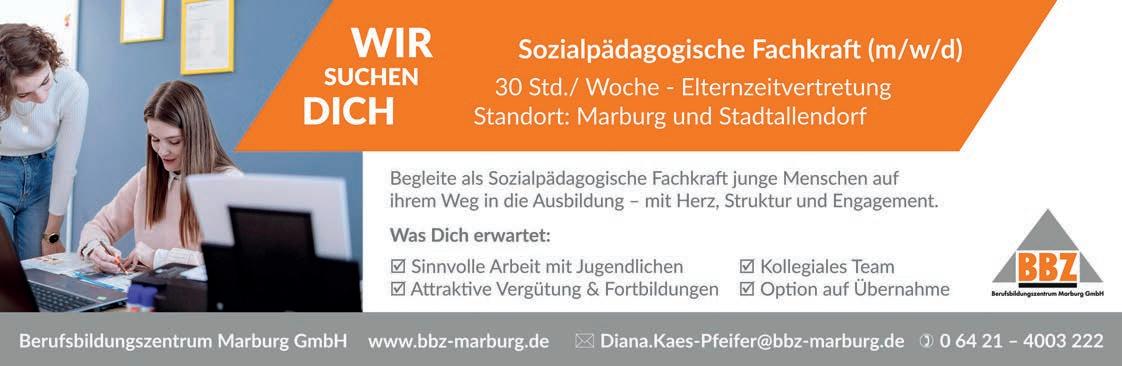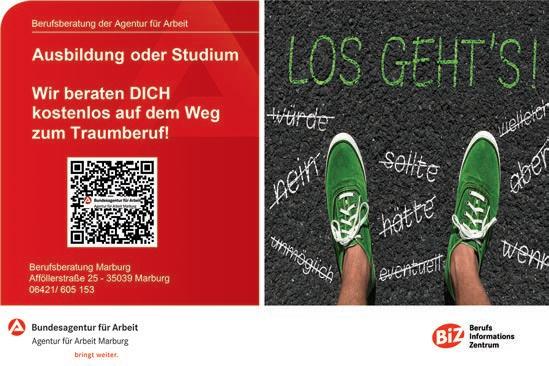 Blindenstudienanstalt bis zu Kulturzentren – haben wir im Sonderteil aufgelistet. Und wer sich für eine Handwerksausbildung interessiert, kann bei der Ausbildungsmesse „Aktionswoche Handwerk – Ausbildung“ am 9. & 10. September in Marburg eine Vielzahl an Berufen in Theorie und Praxis kennenlernen. Angemeldet wird sich online unter www. aktionswochehandwerk.de