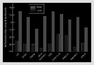 This implies that as the younger, less materialist cohorts, replace the older ones in the adult population, each society should shift from materialist toward postmaterialist values. This is precisely what happened.Figure 12.2shows the net shift from 1970 to 2000 among the six publics we have just analyzed, plus three societies that were first surveyed in 1972 and 1973. In every country, we find a substantial net shift toward postmaterialist values—so much so that they now have more postmaterialists than materialists.