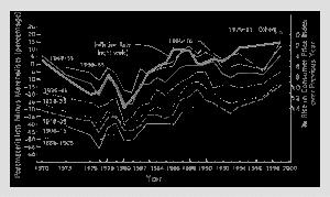 Fig. 12.1 Cohort analysis with inflation rate superimposed (using inverted scale on right): % Postmaterialists minus % materialists in six West European societies, 1970–1999