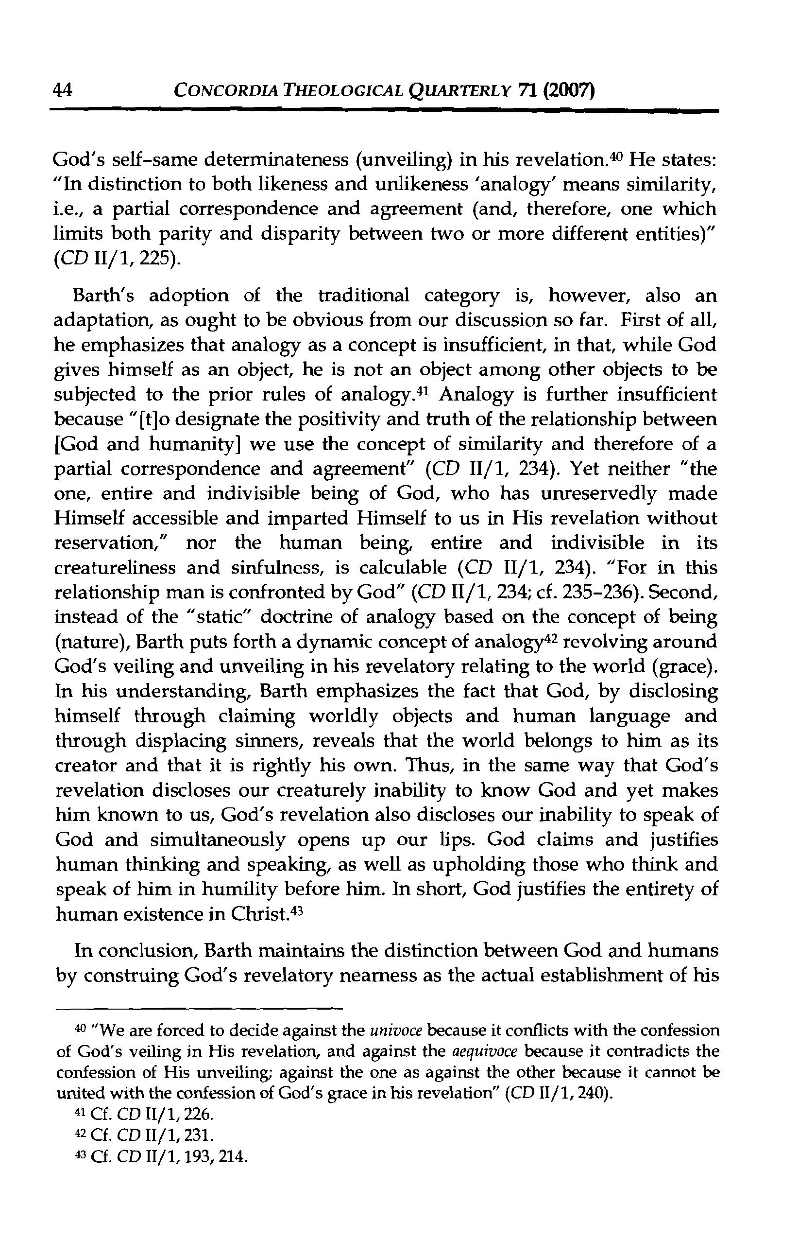 40 "We are forced to decide against the univoce because it conflicts with the confession of God's veiling in His revelation, and against the aequivoce because it contradicts the confession of His unveiling; against the one as against the other because it cannot be united with the confession of God's grace in his revelation" (CD II/1,240).