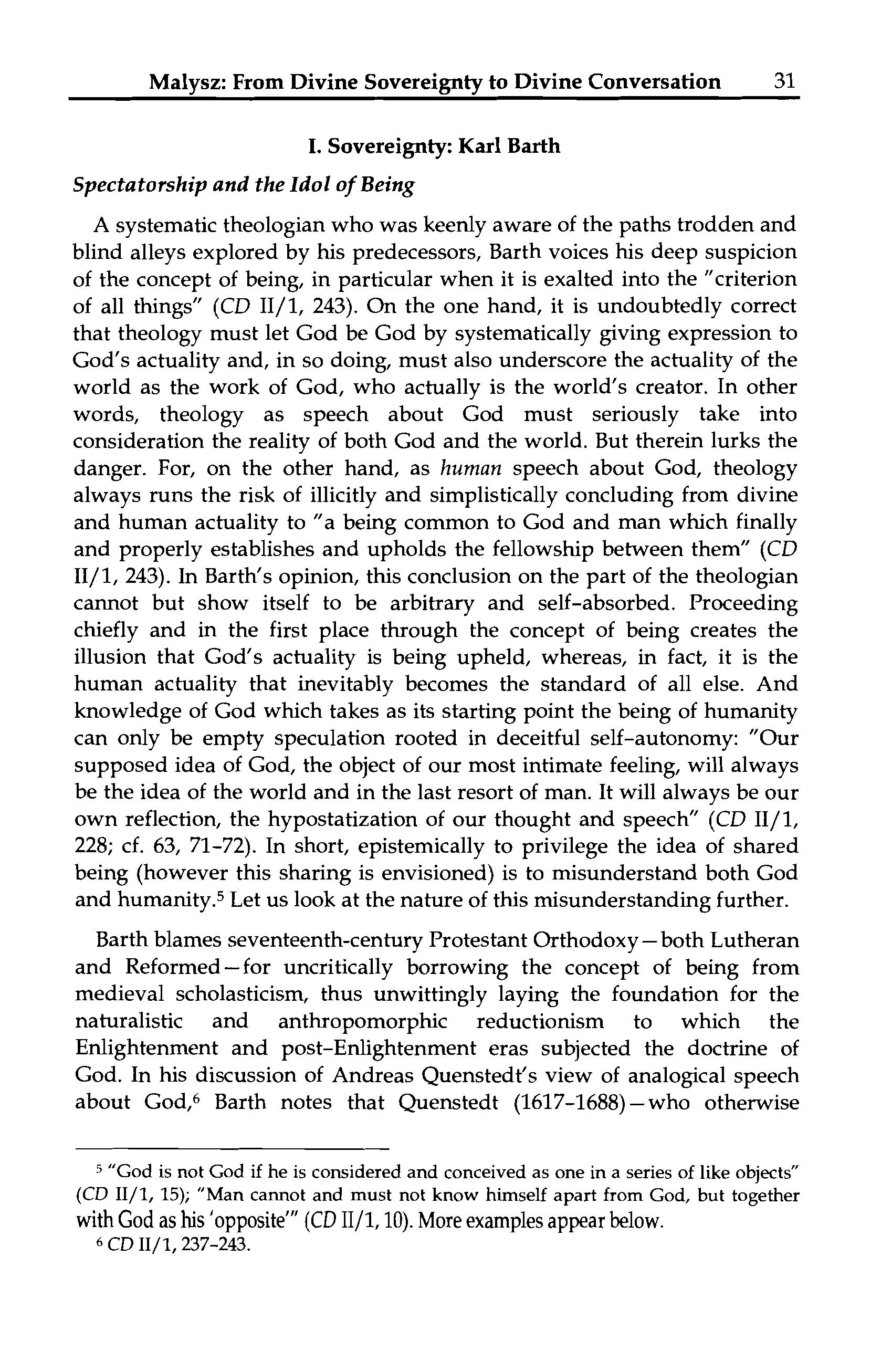 Barth blames seventeenth-century Protestant Orthodoxy- both Lutheran and Reformed-for uncritically borrowing the concept of being from medieval scholasticism, thus unwittingly laying the foundation for the naturalistic and anthropomorphic reductionism to which the Enlightenment and post-Enlightenment eras subjected the doctrine of God. In his discussion of Andreas Quenstedt's view of analogical speech about God,6 Barth notes that Quenstedt (1617-1688)-who otherwise