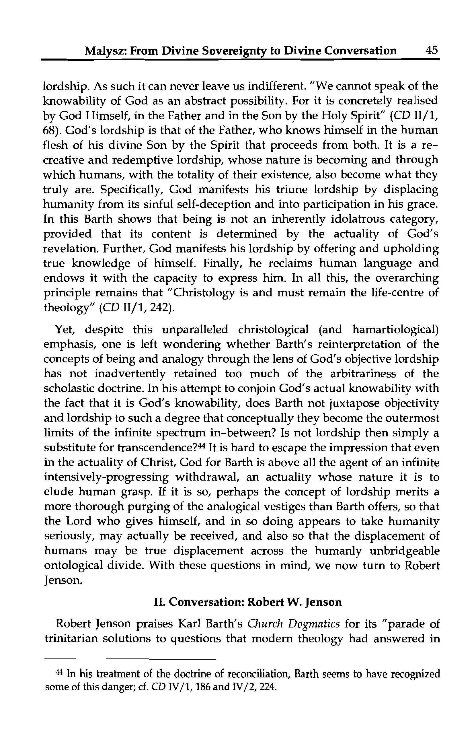 Yet, despite this unparalleled christological (and hamartiological) emphasis, one is left wondering whether Barth's reinterpretation of the concepts of being and analogy through the lens of God's objective lordship has not inadvertently retained too much of the arbitrariness of the scholastic doctrine. In his attempt to conjoin God's actual knowability with the fact that it is God's knowability, does Barth not juxtapose objectivity and lordship to such a degree that conceptually they become the outermost limits of the infinite spectrum in-between? Is not lordship then simply a substitute for transcendence?@It is hard to escape the impression that even in the actuality of Christ, God for Barth is above all the agent of an infinite intensively-progressing withdrawal, an actuality whose nature it is to elude human grasp. If it is so, perhaps the concept of lordship merits a more thorough purging of the analogical vestiges than Barth offers, so that the Lord who gives himself, and in so doing appears to take humanity seriously, may actually be received, and also so that the displacement of humans may be true displacement across the humanly unbridgeable ontological divide. With these questions in mind, we now turn to Robert Jenson.