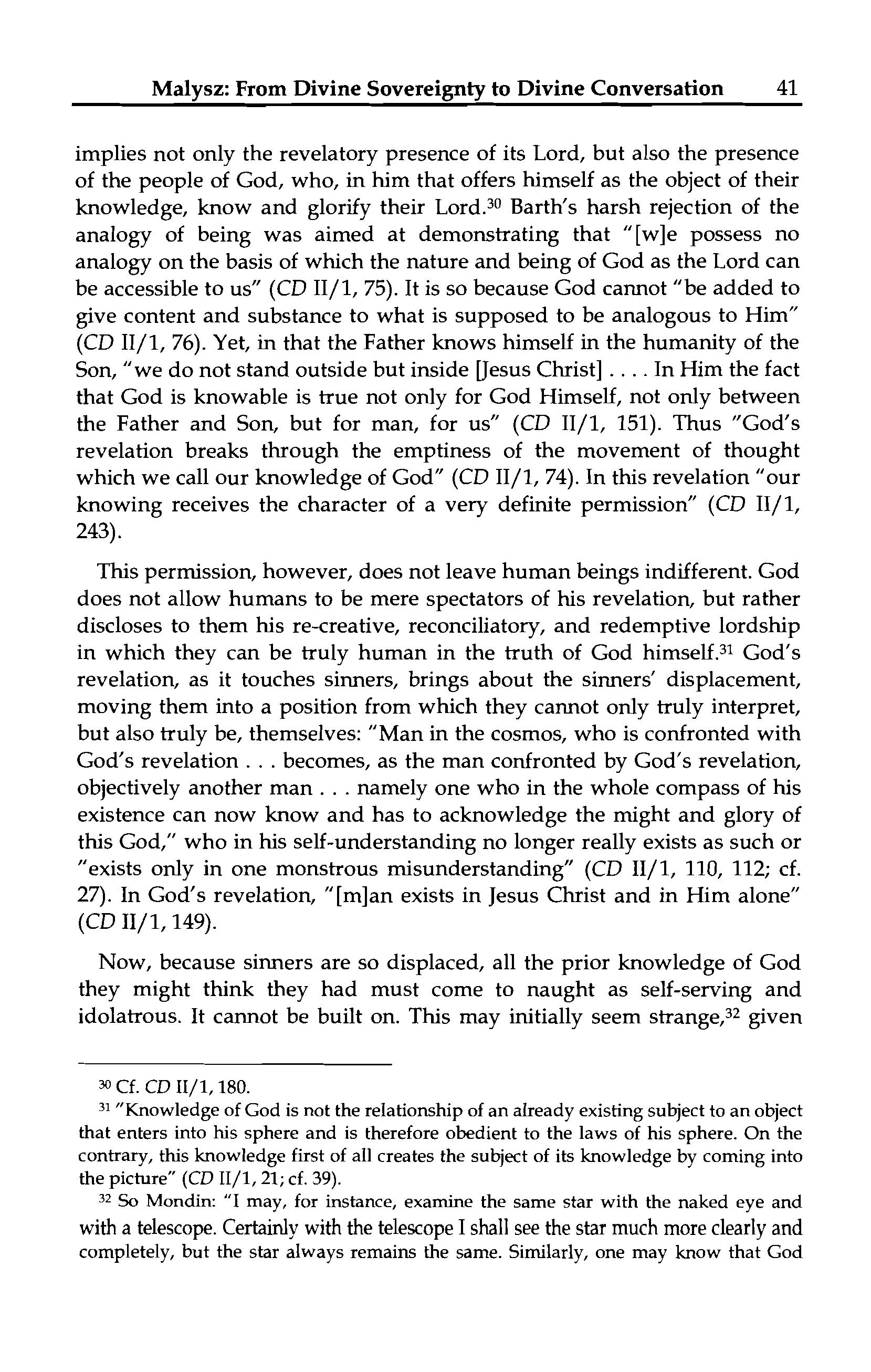 31 "Knowledge of God is not the relationship of an already existing subject to an object that enters into his sphere and is therefore obedient to the laws of his sphere. On the contrary, this knowledge first of all creates the subject of its knowledge by coming into the picture" (CD II/1,21; cf. 39).