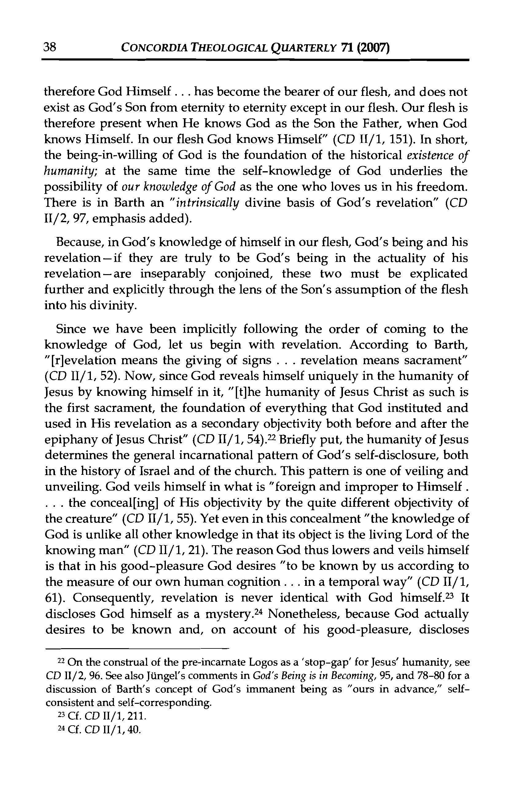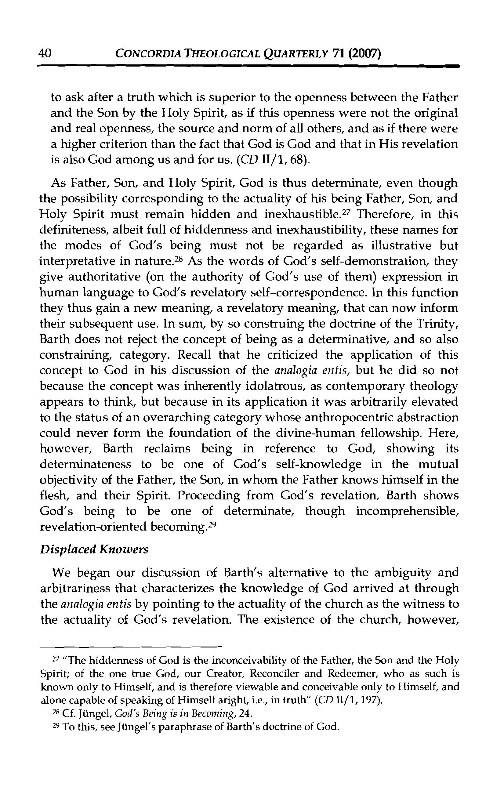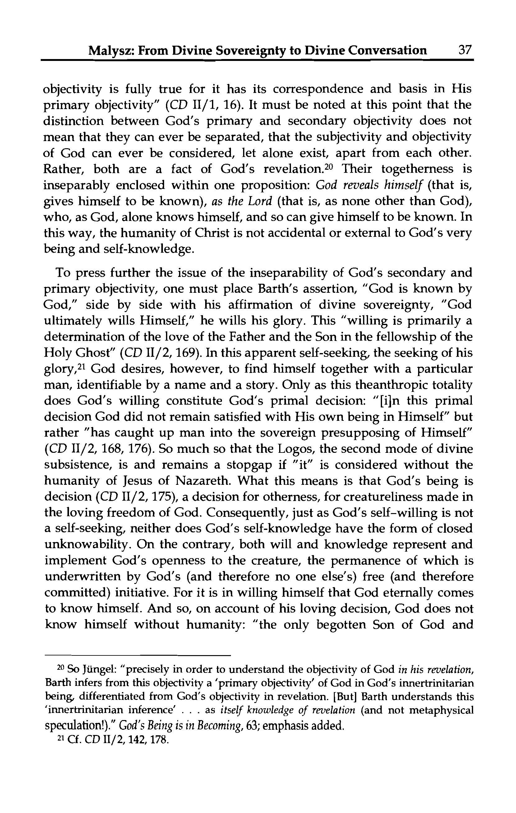 20 SO Jiingel: "precisely in order to understand the objectivity of God in his revelation, Barth infers from this objectivity a 'primary objectivity' of God in God's innertrinitarian being, differentiated from God's objectivity in revelation. [But] Barth understands this 'innertrinitarian inference' as itself knowledge of revelation (and not metaphysical speculation!)." God's Being is in Becoming, 63; emphasis added.