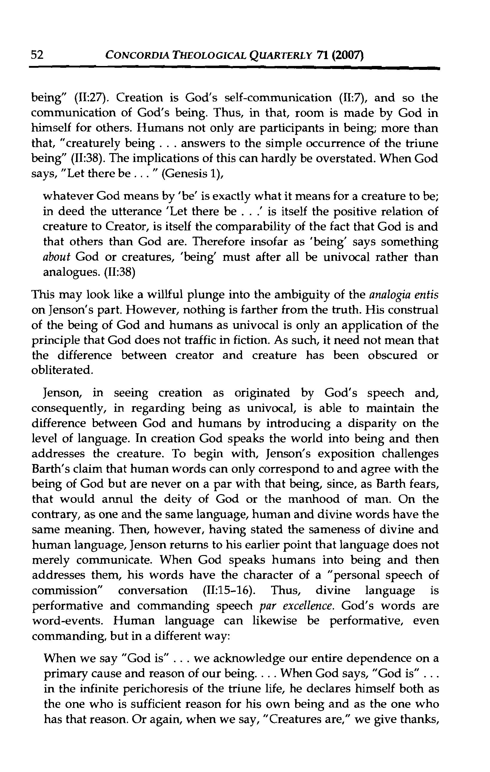 Jenson, in seeing creation as originated by God's speech and, consequently, in regarding being as univocal, is able to maintain the difference between God and humans by introducing a disparity on the level of language. In creation God speaks the world into being and then addresses the creature. To begin with, Jenson's exposition challenges Barth's claim that human words can only correspond to and agree with the being of God but are never on a par with that being, since, as Barth fears, that would annul the deity of God or the manhood of man. On the contrary, as one and the same language, human and divine words have the same meaning. Then, however, having stated the sameness of divine and human language, Jenson returns to his earlier point that language does not merely communicate. When God speaks humans into being and then addresses them, his words have the character of a "personal speech of commission" conversation (11:15-16) Thus, divine language is performative and commanding speech par excellence. God's words are word-events. Human language can likewise be performative, even commanding, but in a different way: