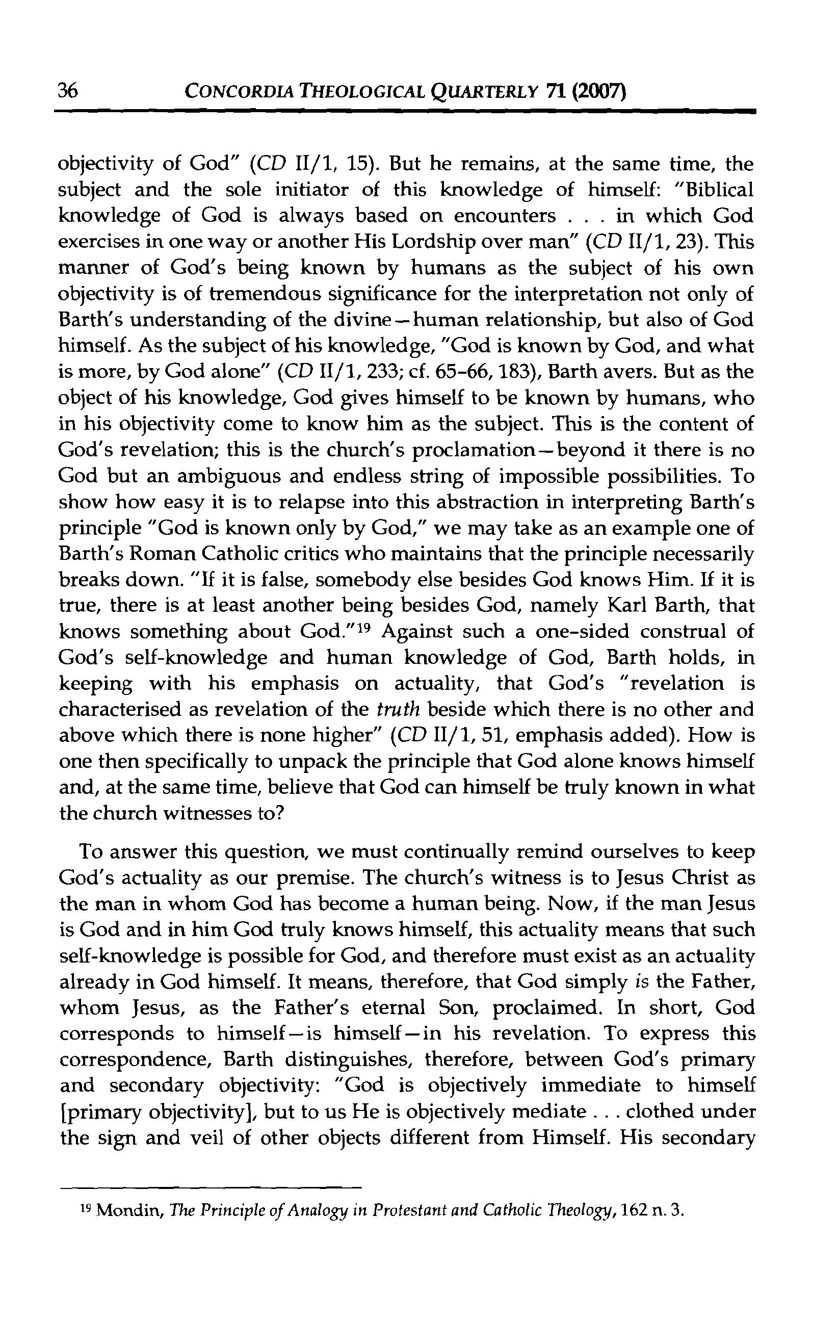 objectivity of God" (CD II/1, 15). But he remains, at the same time, the subject and the sole initiator of this knowledge of himself: "Biblical knowledge of God is always based on encounters . . . in which God exercises in one way or another His Lordship over man" (CD 11/1,23). This manner of God's being known by humans as the subject of his own objectivity is of tremendous significance for the interpretation not only of Barth's understanding of the divine -human relationship, but also of God himself. As the subject of his knowledge, "God is known by God, and what is more, by God alone" (CD II/1,233; cf. 65-66,183), Barth avers. But as the object of his knowledge, God gives himself to be known by humans, who in his objectivity come to know him as the subject. This is the content of God's revelation; this is the church's proclamation-beyond it there is no God but an ambiguous and endless string of impossible possibilities. To show how easy it is to relapse into this abstraction in interpreting Barth's principle "God is known only by God," we may take as an example one of Barth's Roman Catholic critics who maintains that the principle necessarily breaks down. "If it is false, somebody else besides God knows Him. If it is true, there is at least another being besides God, namely Karl Barth, that knows something about God."'9 Against such a one-sided construal of God's self-knowledge and human knowledge of God, Barth holds, in keeping with his emphasis on actuality, that God's "revelation is characterised as revelation of the truth beside which there is no other and above which there is none higher" (CD II/1,51, emphasis added). How is one then specifically to unpack the principle that God alone knows himself and, at the same time, believe that God can himself be truly known in what the church witnesses to?