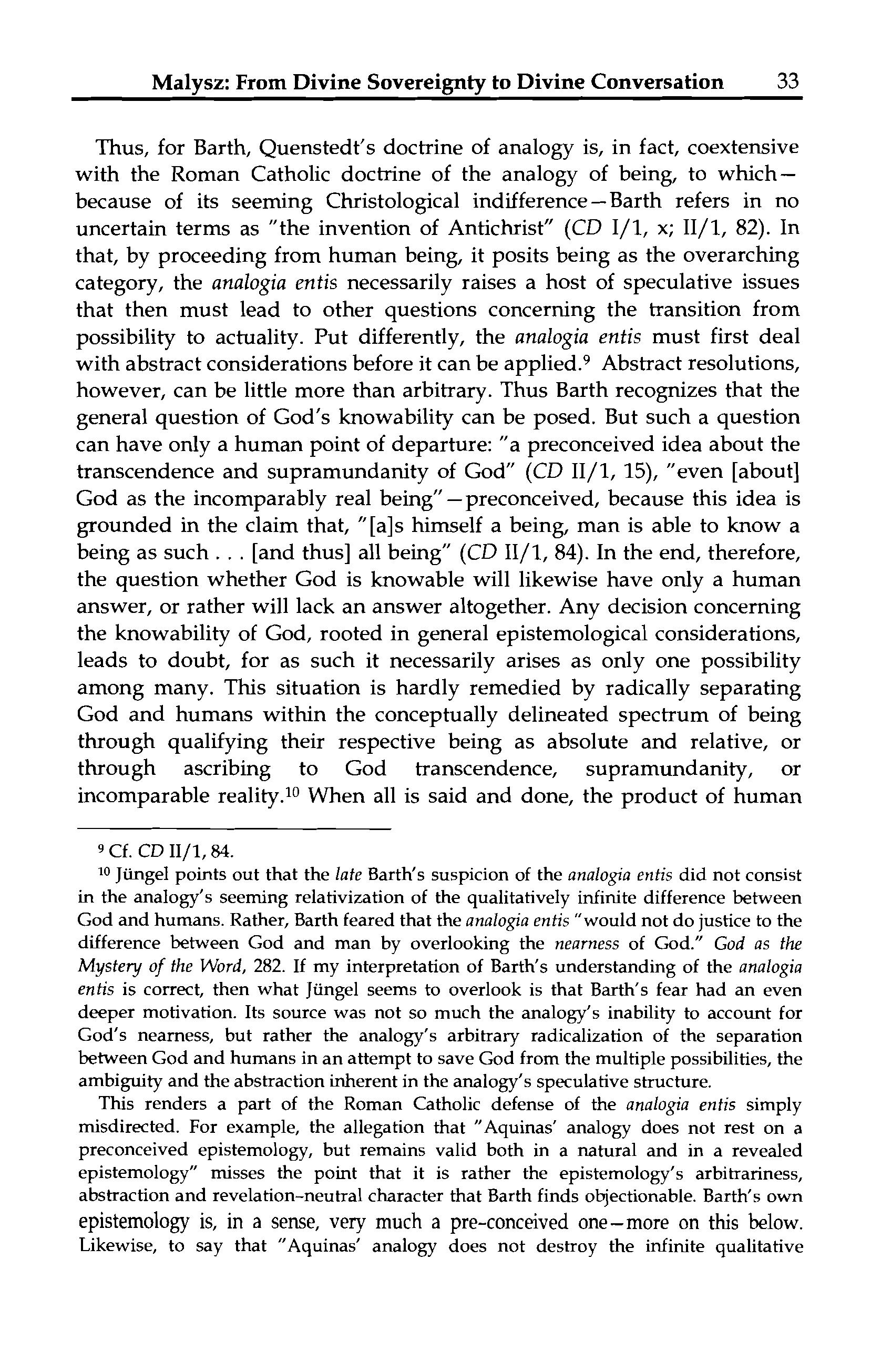 Thus, for Barth, Quenstedt's doctrine of analogy is, in fact, coextensive with the Roman Catholic doctrine of the analogy of being, to whichbecause of its seeming Christological indifference-Barth refers in no uncertain terms as "the invention of Antichrist" (CD I/1, x; II/l, 82). In that, by proceeding from human being, it posits being as the overarching category, the analogia entis necessarily raises a host of speculative issues that then must lead to other questions concerning the transition from possibility to actuality. Put differently, the analogia entis must first deal with abstract considerations before it can be applied.9 Abstract resolutions, however, can be little more than arbitrary. Thus Barth recognizes that the general question of God's knowability can be posed. But such a question can have only a human point of departure: "a preconceived idea about the transcendence and supramundanity of God" (CD II/l, 15), "even [about] God as the incomparably real being" -preconceived, because this idea is grounded in the claim that, "[als himself a being, man is able to know a being as such [and thus] all being" (CD II/l, 84). In the end, therefore, the question whether God is knowable will likewise have only a human answer, or rather will lack an answer altogether. Any decision concerning the knowability of God, rooted in general epistemological considerations, leads to doubt, for as such it necessarily arises as only one possibility among many. This situation is hardly remedied by radically separating God and humans within the conceptually delineated spectrum of being through qualifying their respective being as absolute and relative, or through ascribing to God transcendence, supramundanity, or incomparable reality.10 When all is said and done, the product of human