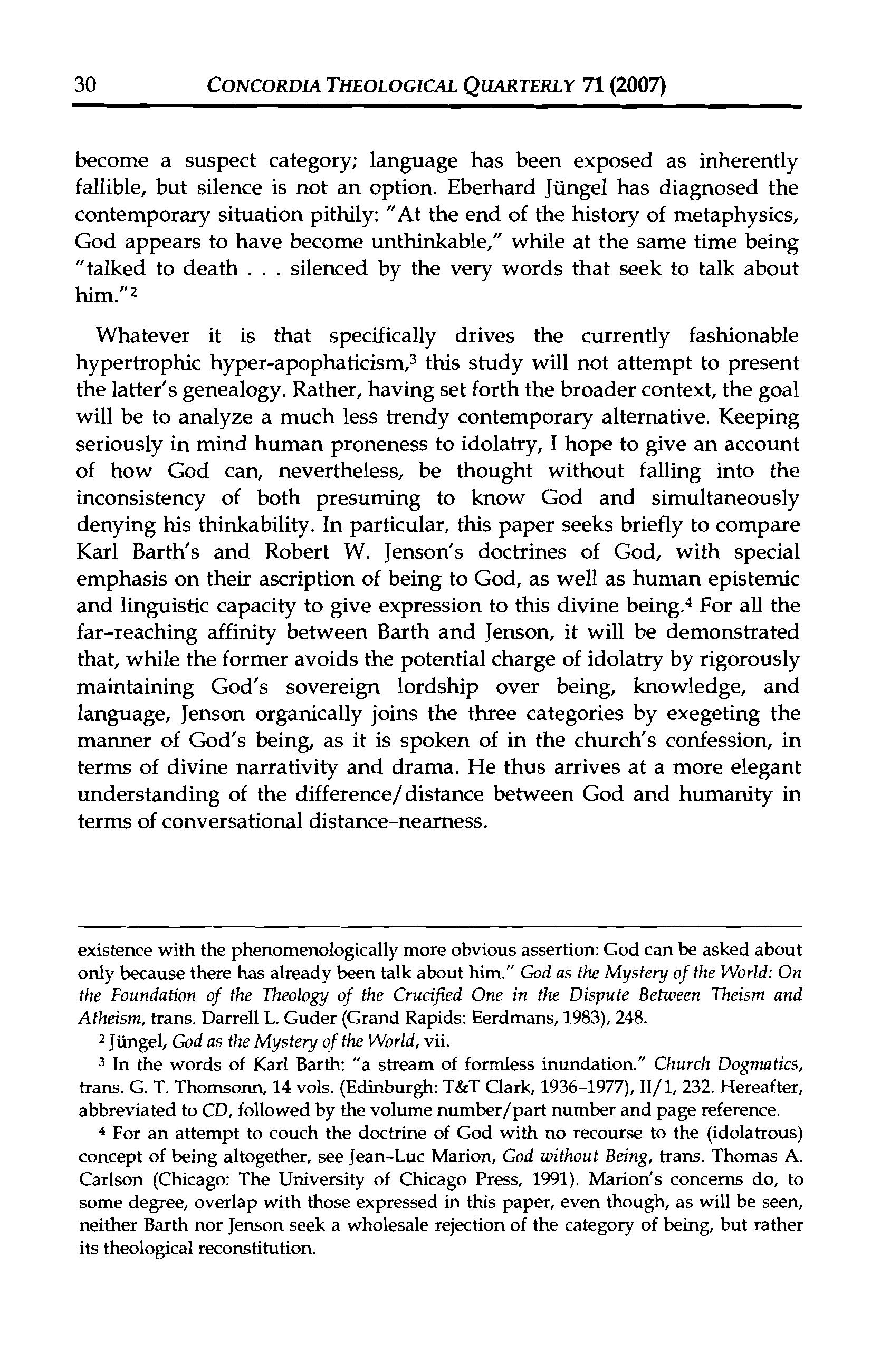 4 For an attempt to couch the doctrine of God with no recourse to the (idolatrous) concept of being gltogether, see Jean-Luc Marion, God without Being, trans. Thomas A. Carlson (Chicago: The University of Chicago Press, 1991). Marion's concerns do, to some degree, overlap with those expressed in this paper, even though, as will be seen, neither Barth nor Jenson seek a wholesale rejection of the category of being, but rather its theological reconstitution.