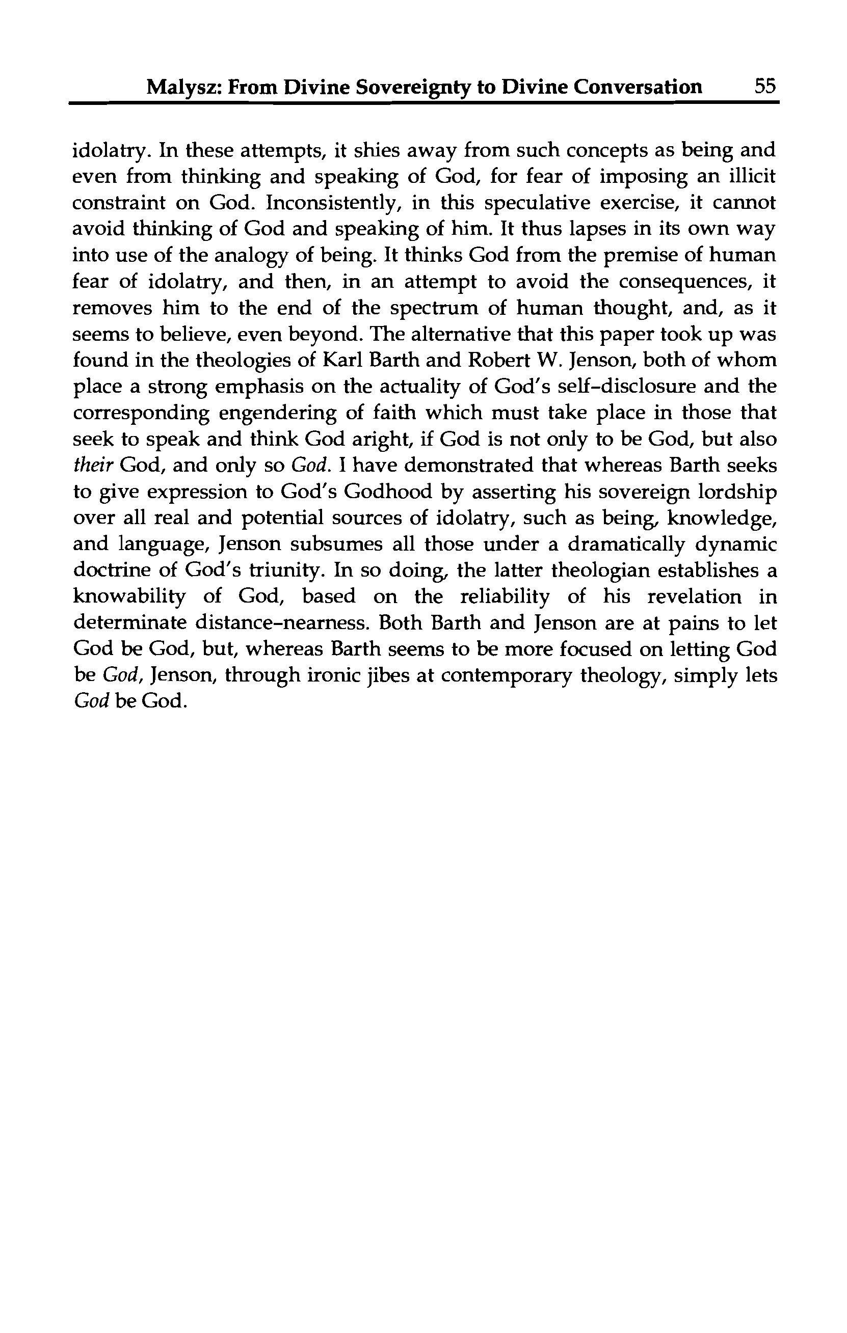 idolatry. In these attempts, it shies away from such concepts as being and even from thinking and speaking of God, for fear of imposing an illicit constraint on God. Inconsistently, in this speculative exercise, it cannot avoid thinking of God and speaking of him. It thus lapses in its own way into use of the analogy of being. It thinks God from the premise of human fear of idolatry, and then, in an attempt to avoid the consequences, it removes him to the end of the spectrum of human thought, and, as it seems to believe, even beyond. The alternative that this paper took up was found in the theologies of Karl Barth and Robert W. Jenson, both of whom place a strong emphasis on the actuality of God's self-disclosure and the corresponding engendering of faith which must take place in those that seek to speak and think God aright, if God is not only to be God, but also their God, and only so God. I have demonstrated that whereas Barth seeks to give expression to God's Godhood by asserting his sovereign lordship over all real and potential sources of idolatry, such as being, knowledge, and language, Jenson subsumes all those under a dramatically dynamic doctrine of God's triunity. In so doing, the latter theologian establishes a knowability of God, based on the reliability of his revelation in determinate distance-nearness. Both Barth and Jenson are at pains to let God be God, but, whereas Barth seems to be more focused on letting God be God, Jenson, through ironic jibes at contemporary theology, simply lets God be God.