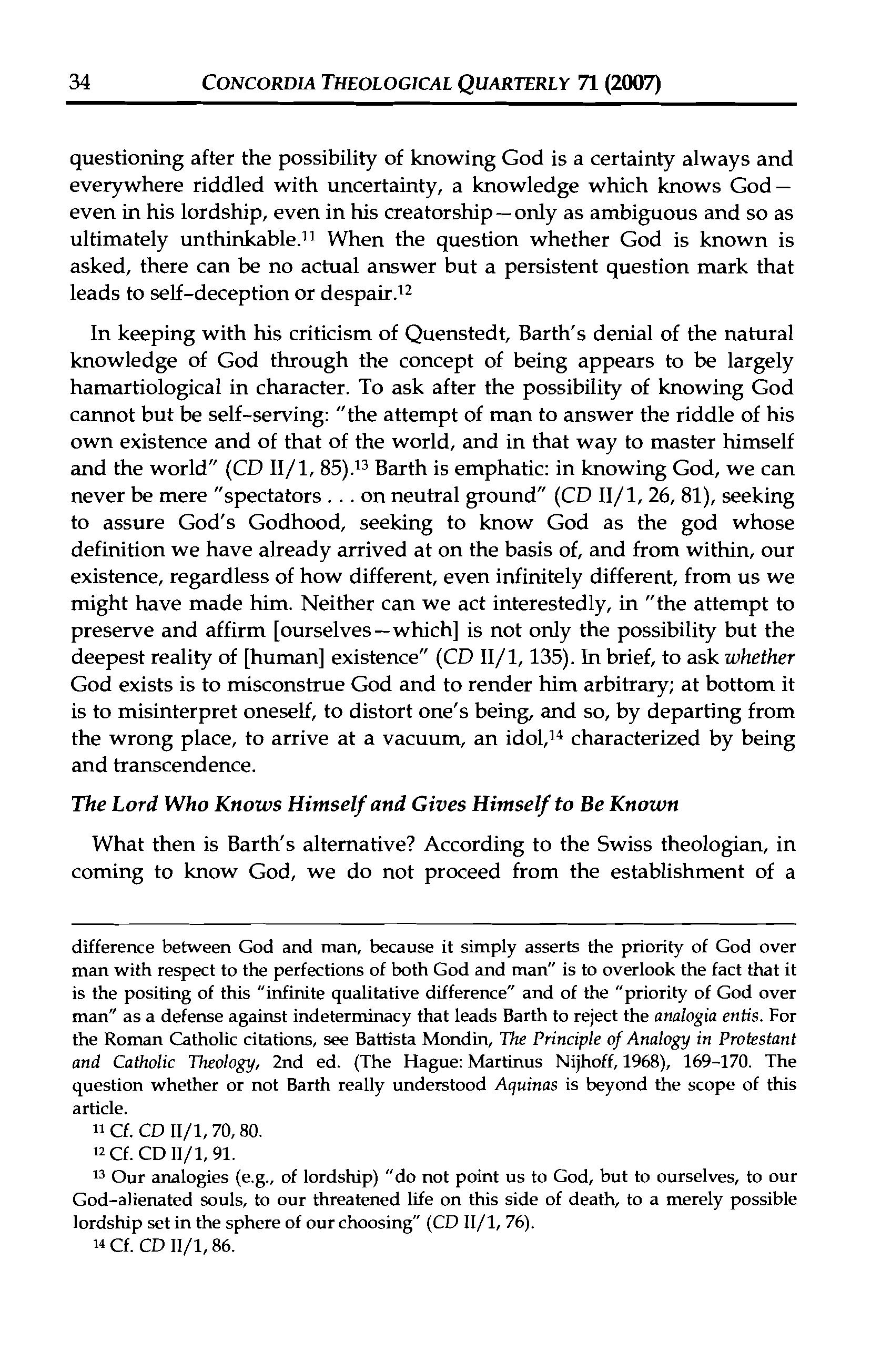 In keeping with his criticism of Quenstedt, Barth's denial of the natural knowledge of God through the concept of being appears to be largely hamartiological in character. To ask after the possibility of knowing God cannot but be self-serving: "the attempt of man to answer the riddle of his own existence and of that of the world, and in that way to master himself and the world" (CD II/1,85).13 Barth is emphatic: in knowing God, we can never be mere "spectators . . . on neutral ground" (CD II/1,26,81), seeking to assure God's Godhood, seeking to know God as the god whose definition we have already arrived at on the basis of, and from within, our existence, regardless of how different, even infinitely different, from us we might have made him. Neither can we act interestedly, in "the attempt to preserve and affirm [ourselves-which] is not only the possibility but the deepest reality of [human] existence" (CD II/1,135). In brief, to ask whether God exists is to misconstrue God and to render him arbitrary; at bottom it is to misinterpret oneself, to distort one's being, and so, by departing from the wrong place, to arrive at a vacuum, an idol,14 characterized by being and transcendence.